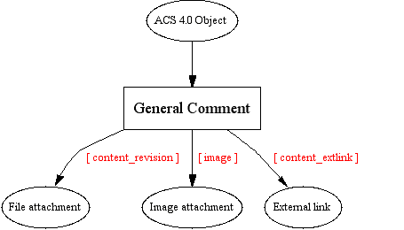 The general_comments table extends acs_messages to provide categorization of comments on a particular object. general_comments also stores the object_id of the object the comment refers to. Relationships from attachments to acs-message is done by using the cr_items.parent_id column.