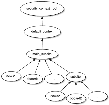 This mechanism allows developers and administrators to define a hierarchy that matches the structure they need for access control in their application. The following picture shows a typical context hierarchy for a hypothetical site: